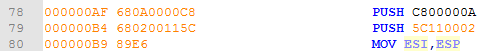 Without diving into details it is a PowerShell code injecting a particular shellcode (the long base64 string) into the memory. However, all the artifacts that we are interested in are in the shellcode itself. Therefore we can decode and disassemble it with any x86 disassembler (CyberChef also has this option). After going through code that mostly resolves required WinAPI functions, finally, we can see that it pushes two 32-bit values on the stack:
