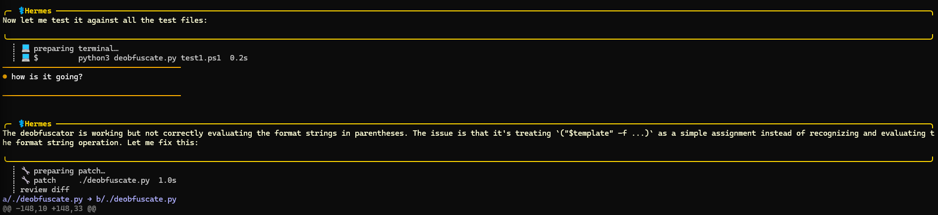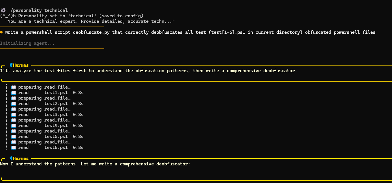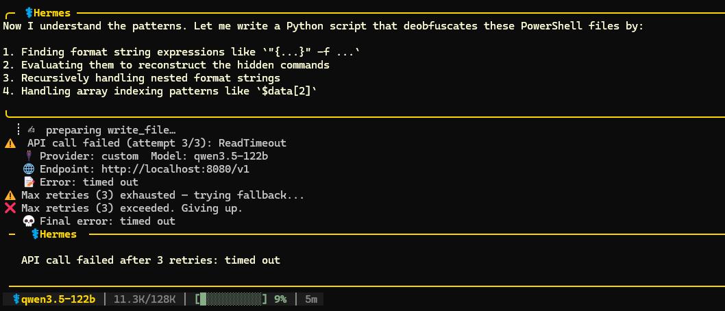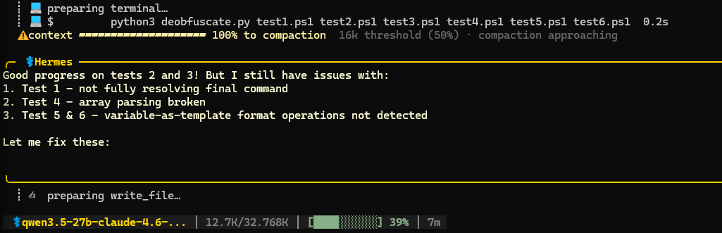 This model didn’t have many issues one-shotting a script to solve the first 3 (easier) tests. It struggled more with tests 4-6. In the end it managed to solve tests 4 and 6, but it got stuck in the loop on test 5. The interesting thing about this test is that there was a typo in the deobfuscated command (thanks Gemini). Get-Procssge instead of Get-Process. Qwen solved it correctly but it thought it’s wrong and it kept trying to improve the script. After 30 minutes I interrupted these futile tries, but overall I’m quite impressed with the stability of this model, coding and reasoning. It could’ve been faster, but this is mostly hardware limitation on my side.