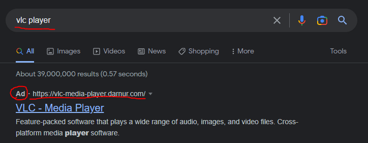 Today when looking to download a new version of VLC Player, I got served with this malicious advertisement on google and thought it might be an excellent opportunity to show how to make a quick malware triage. In this article, I show not only what are the dangers of malicious advertisements in google, but also how to triage malware in 30 minutes without any knowledge of coding, assembly, or reverse engineering tools like disassemblers or debuggers. I only use basic, freely available tools but yet I am able to discover not only malware family, and all important indicators of compromise (IoCs) but also can make good assumptions about its capabilities.